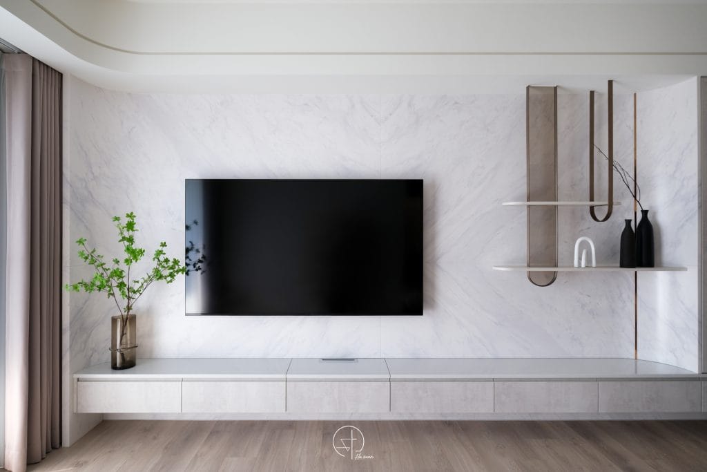 - 大理石紋電視牆以對稱鋪陳,鐵件層架以細框線條穿插其間,加入垂直元素,平衡石材的水平延展,讓空間更具節奏。