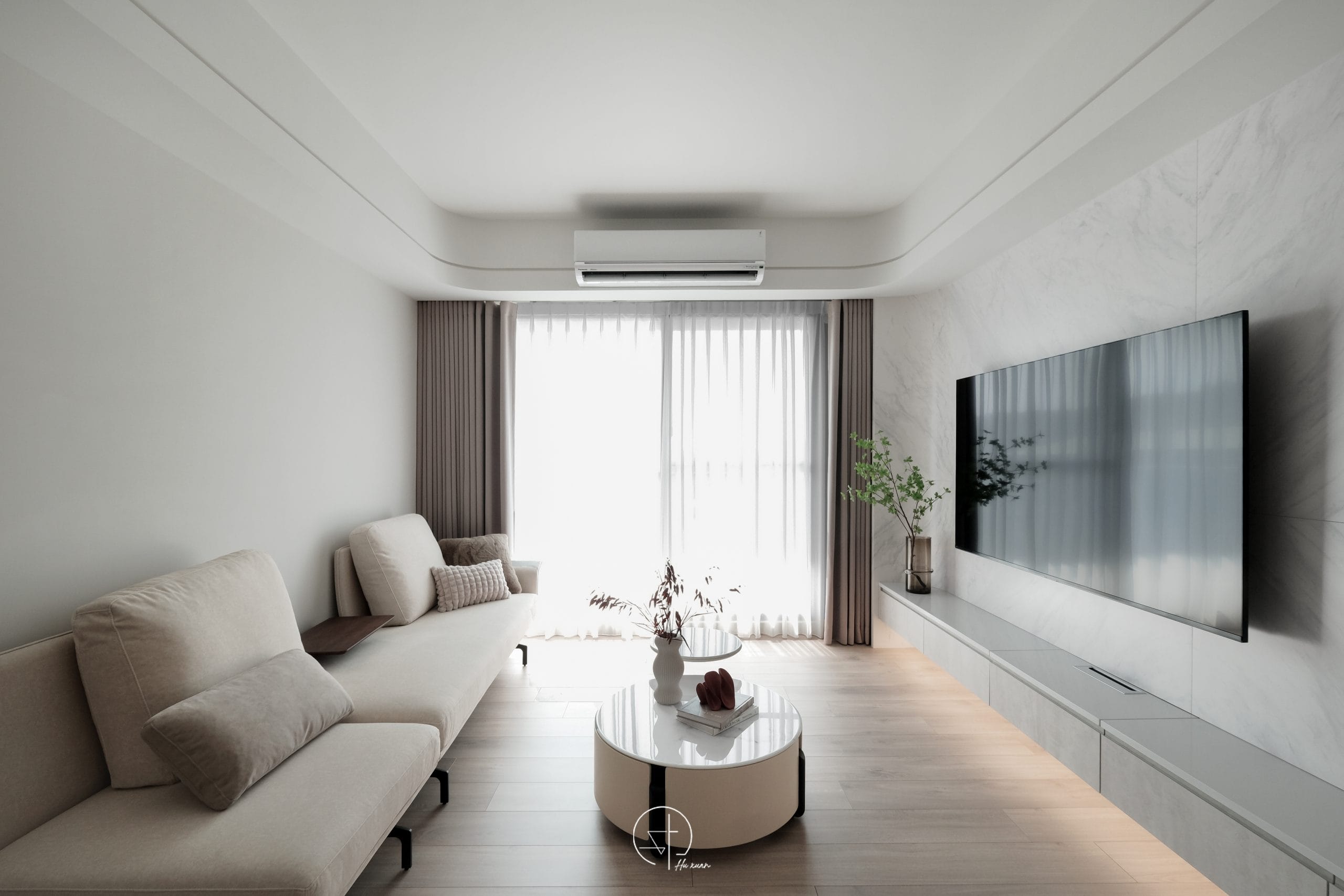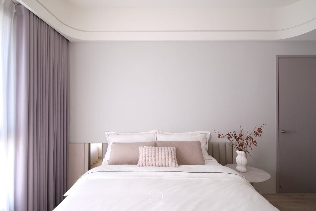 - 大面留白的牆面,搭配細膩石紋紋理,營造安靜卻不單調的視覺層次,弧形門片與圓角天花呼應,使空間語彙更為一致而柔和。