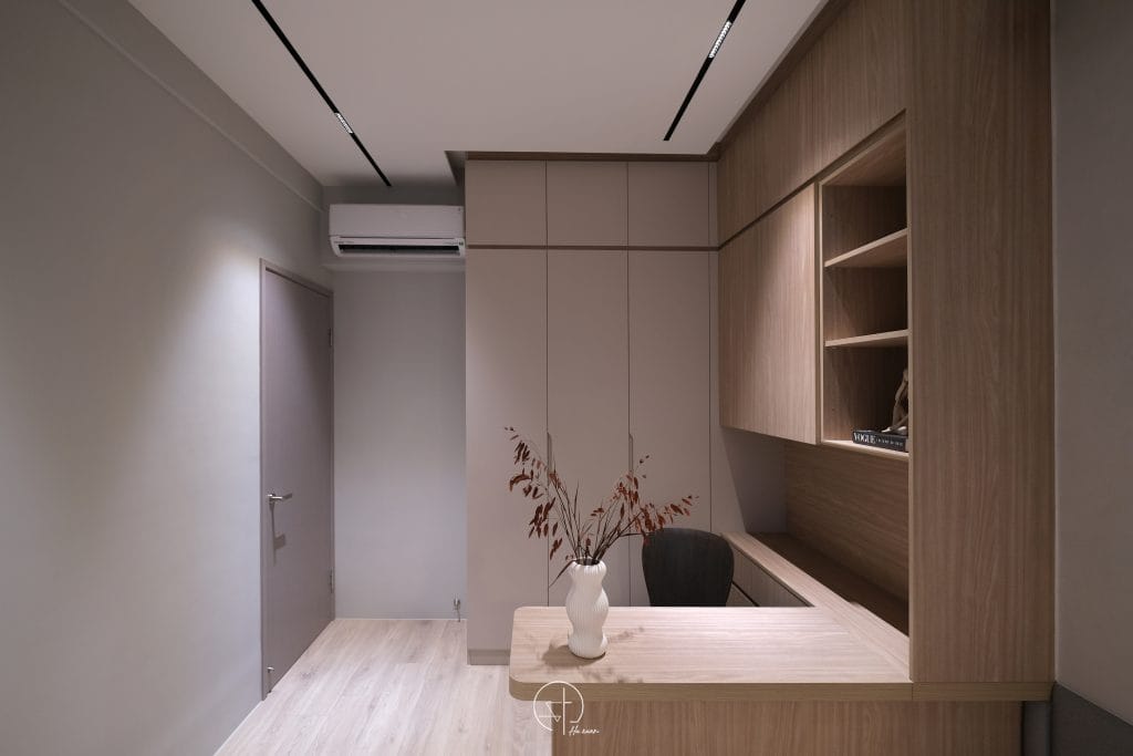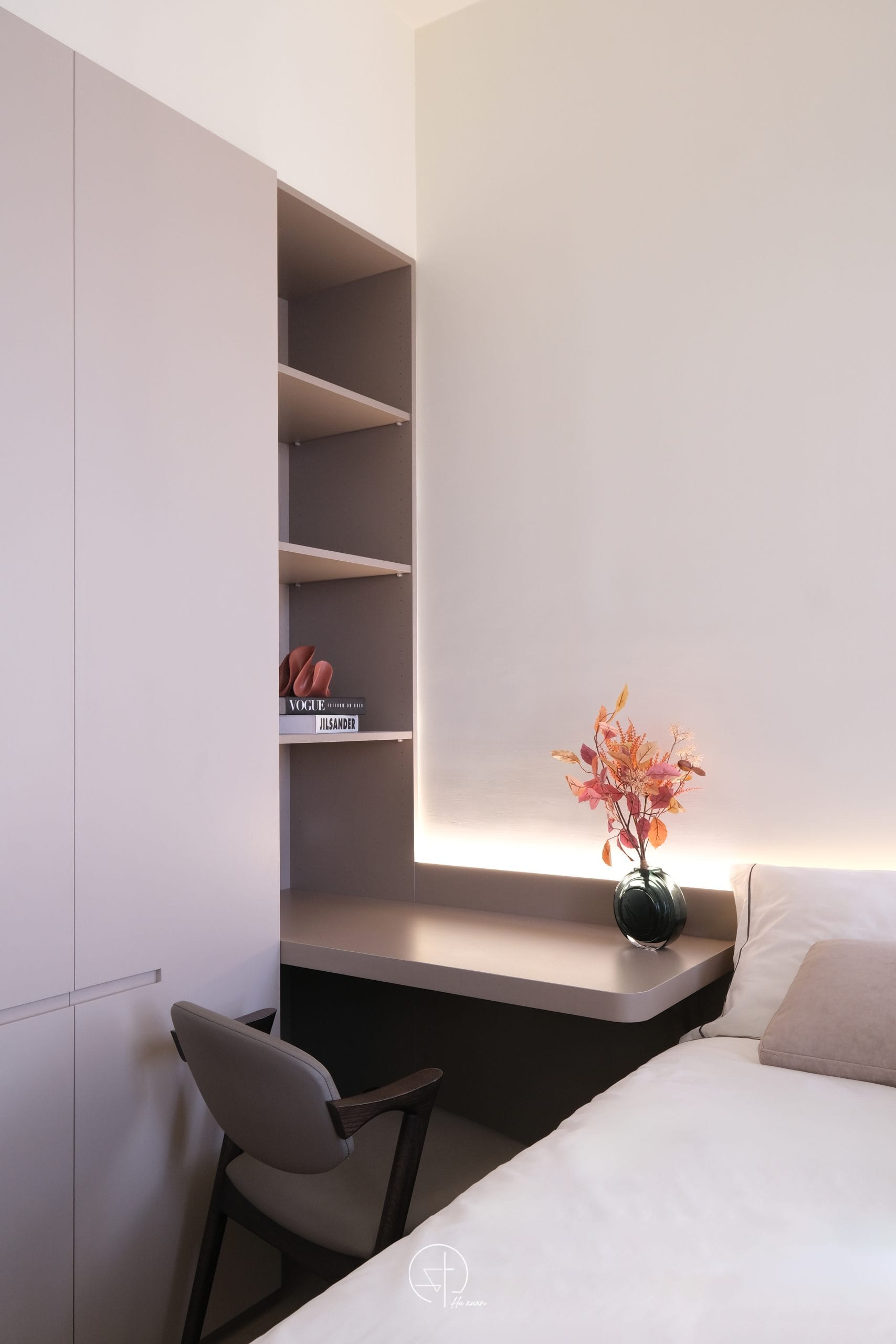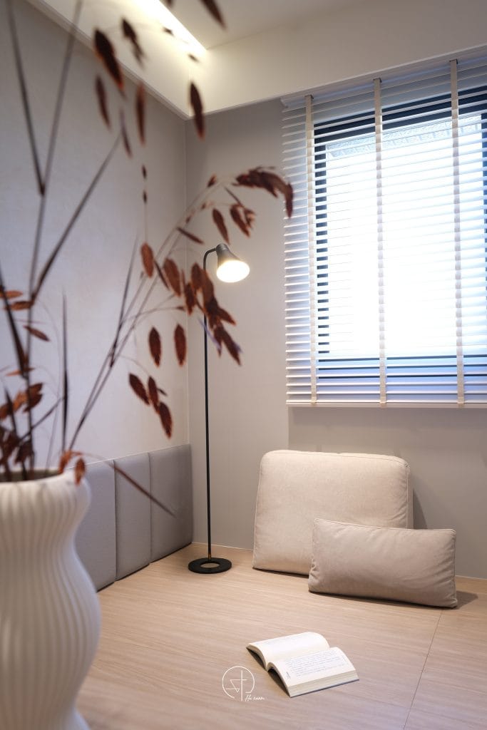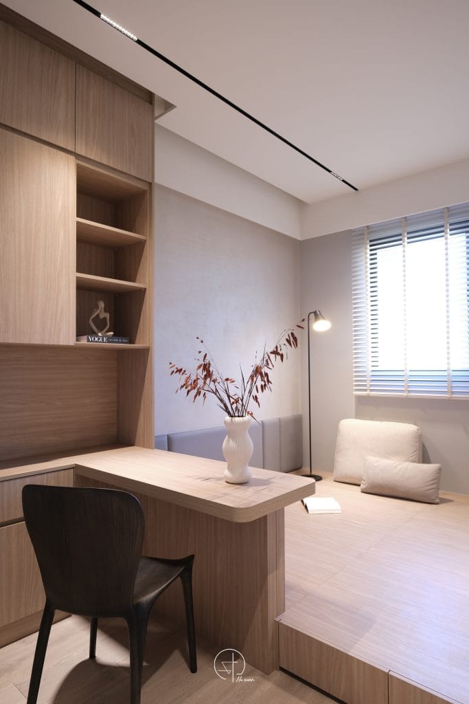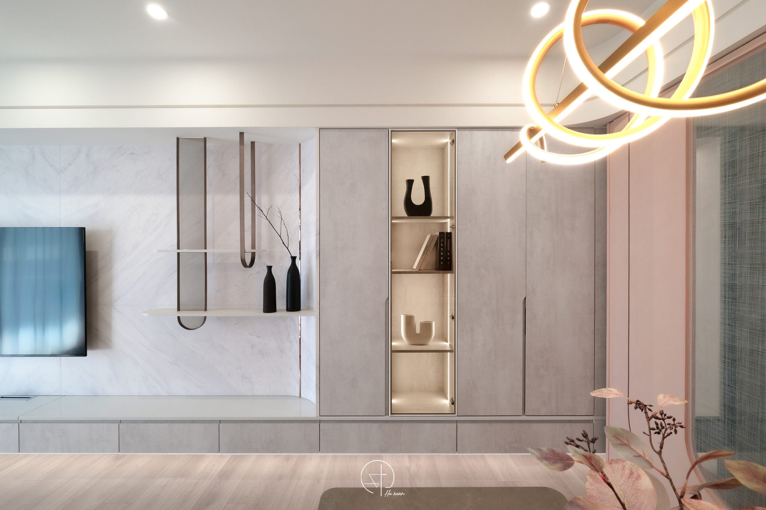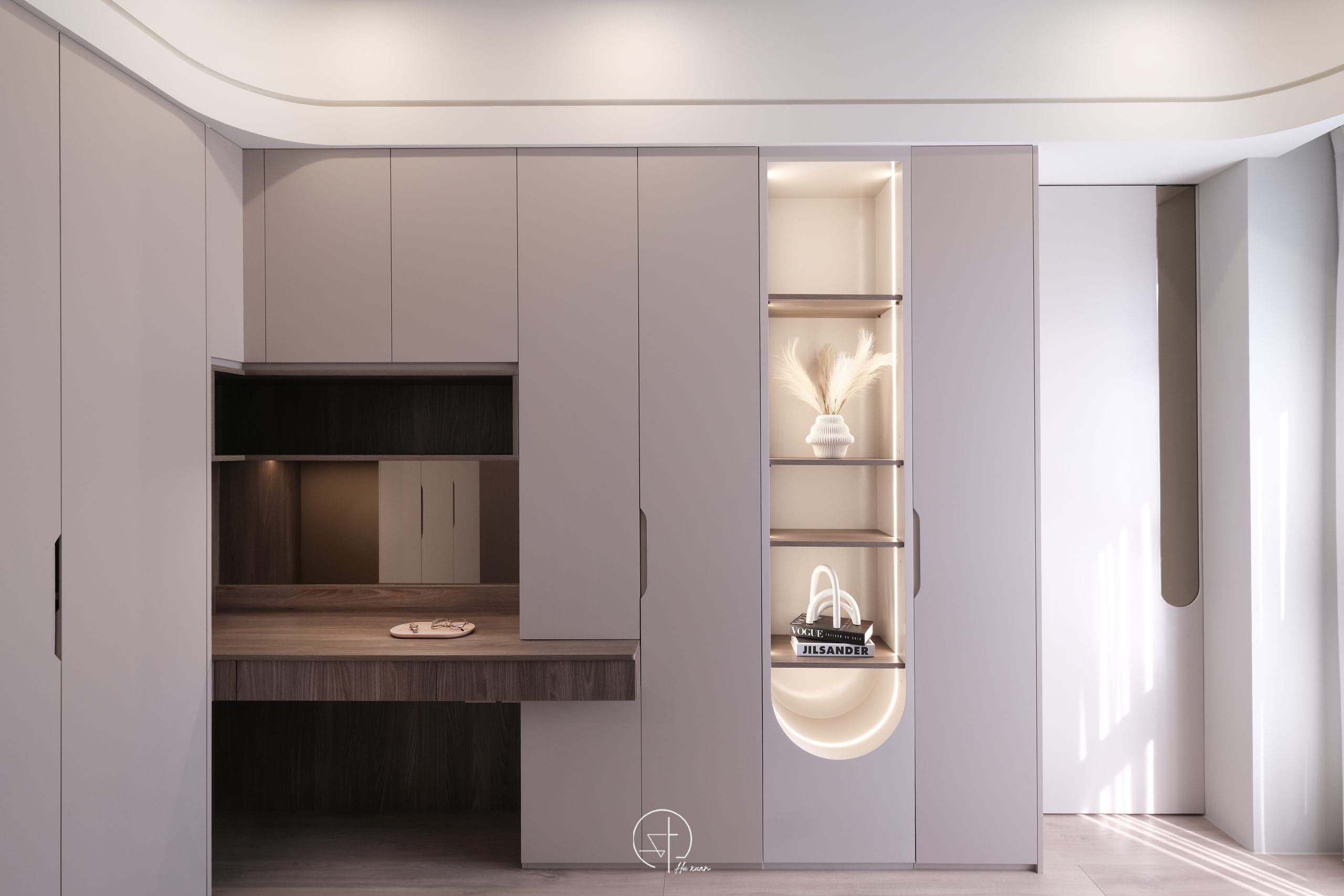 空間像被晨光輕輕安放弧線收起了銳利的邊角,讓牆面與櫃體不再只是結構,細膩紋理在光影之中若隱若現,金屬線條輕輕點綴其間,像是一筆克制的光澤,讓溫柔多了一點深度不喧嘩,卻耐看。