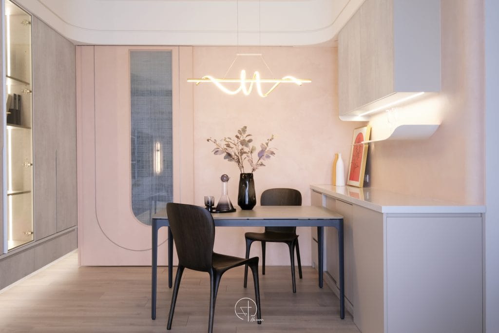 - 粉霧色立面成為用餐區的主視覺,垂直長窗延伸空間比例,使光線成為最自然的裝飾,線性吊燈以流動姿態懸掛其上,替理性結構增添感性溫度。
