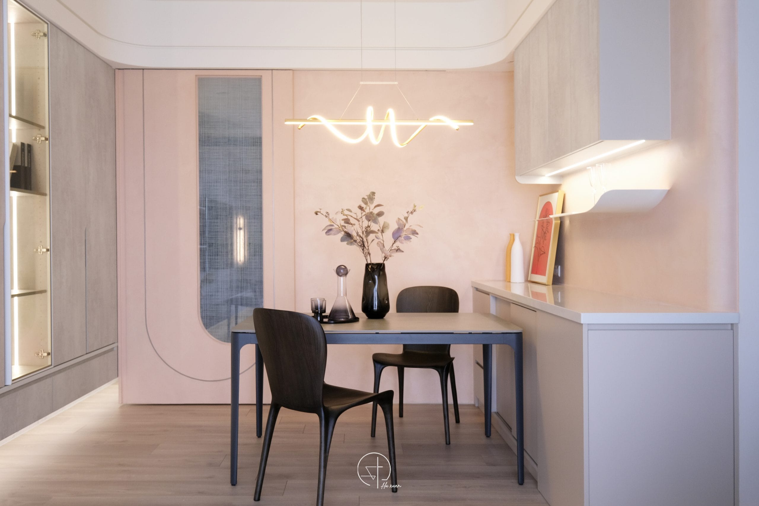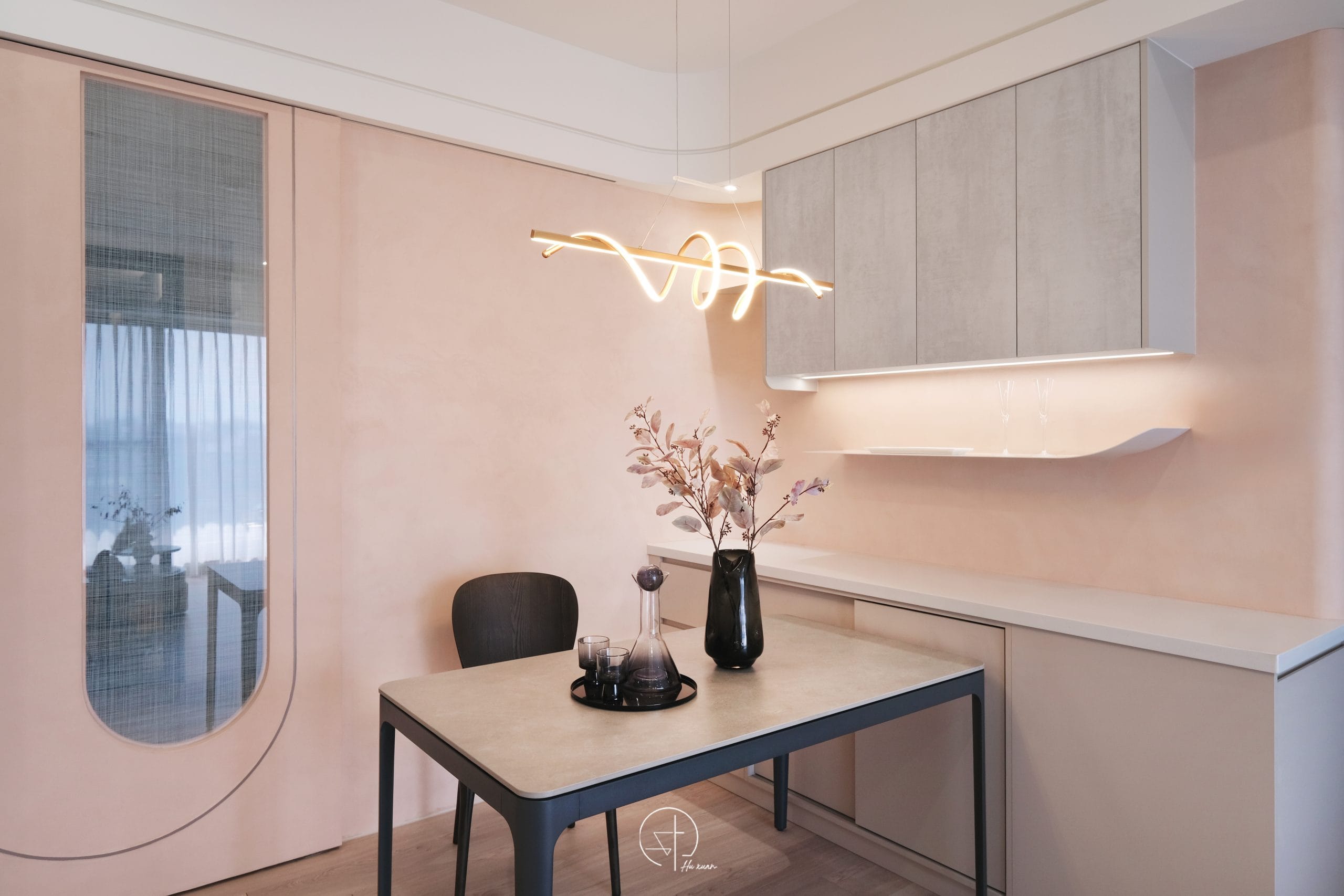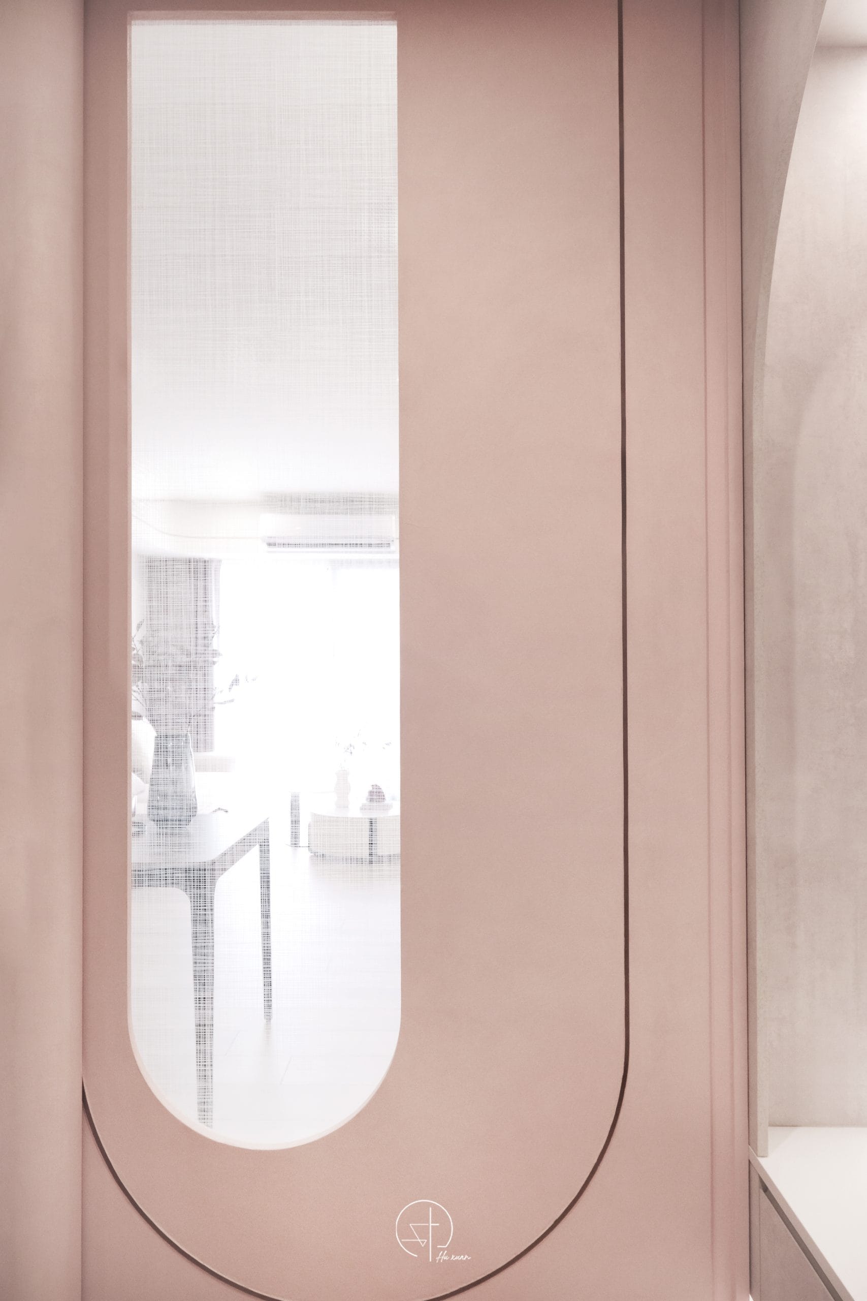 以柔霧粉色為空間基底,融合弧線語彙與低彩度材質,形塑溫潤而安靜的生活氛圍