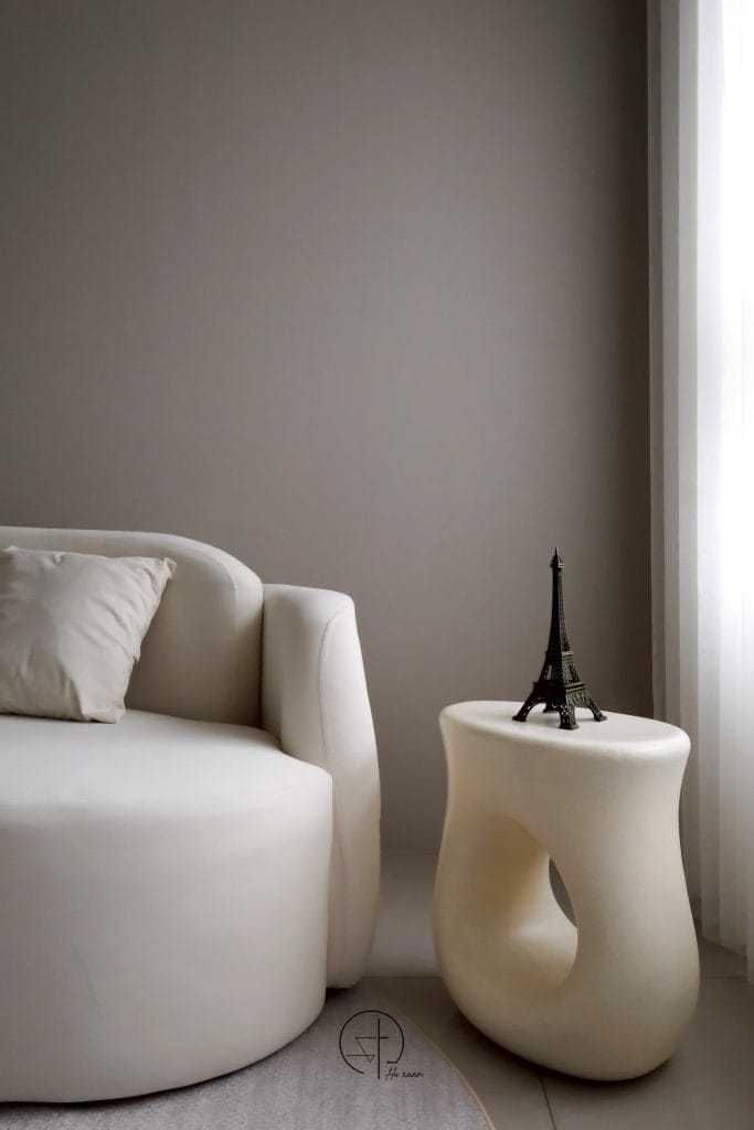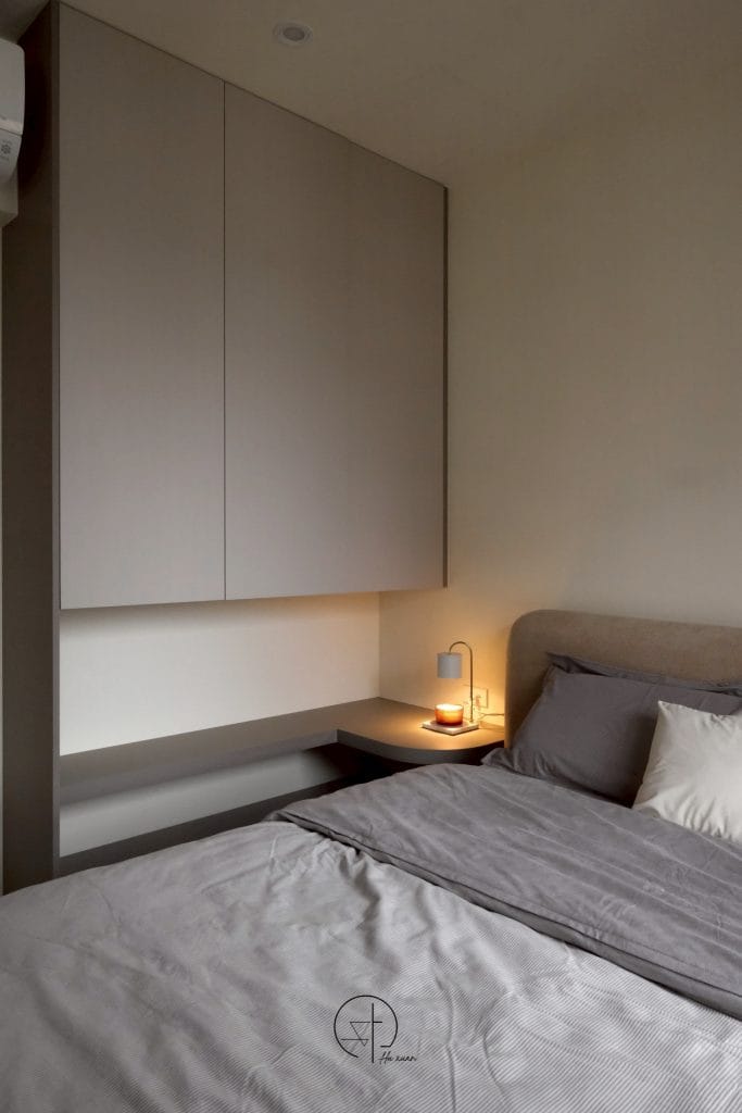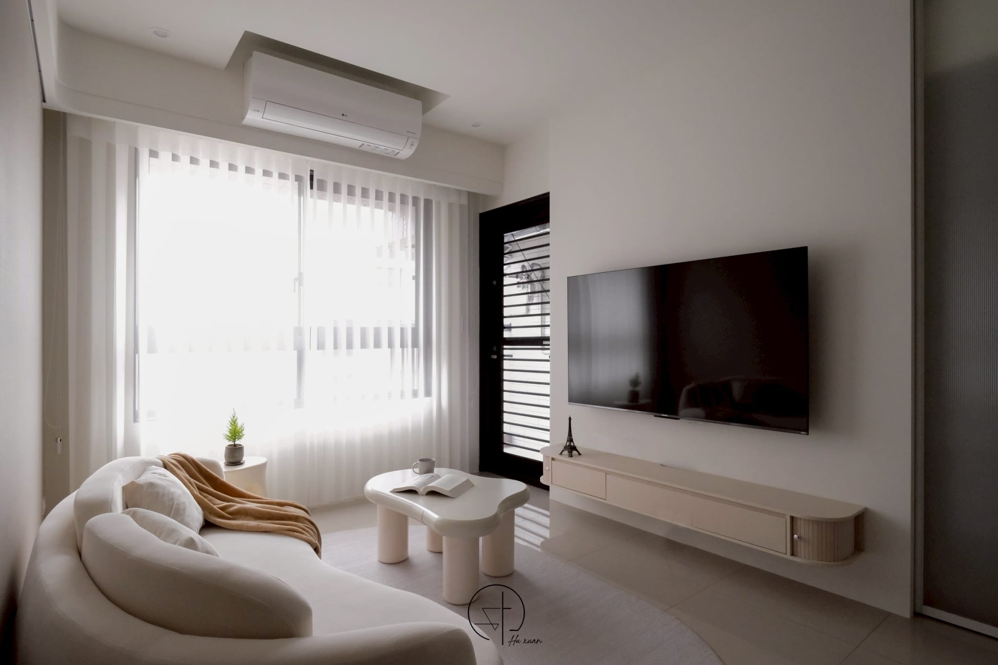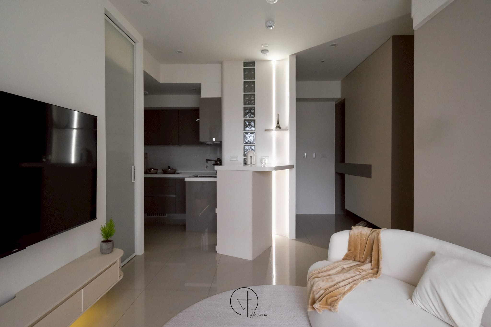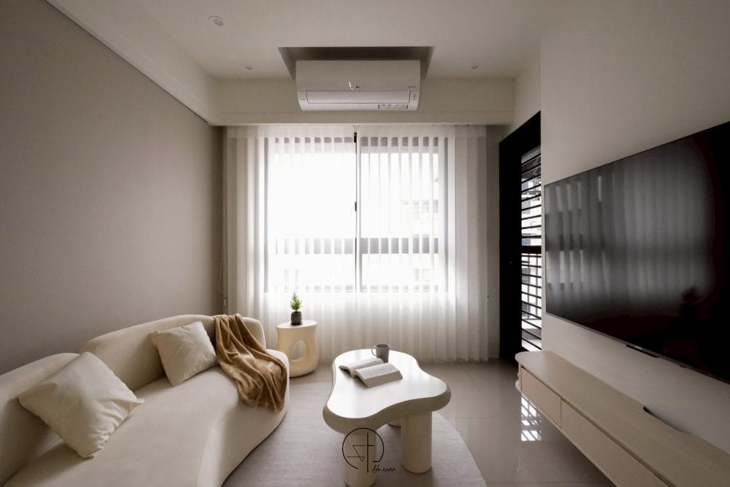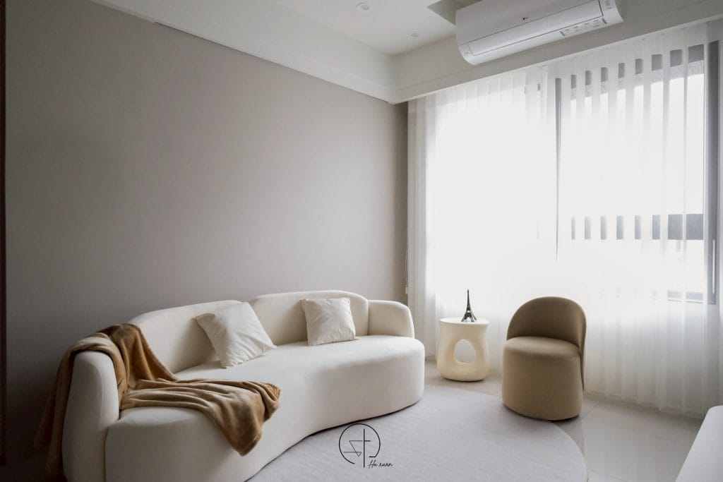 整體空間以白色、米色與灰色為主色調,透過簡約線條與中性色彩,營造出溫潤舒適、沉靜放鬆的氛圍。自然光與隱藏式燈帶相輔相成,巧妙地提升空間的層次與光影變化。