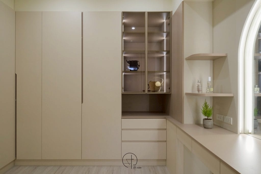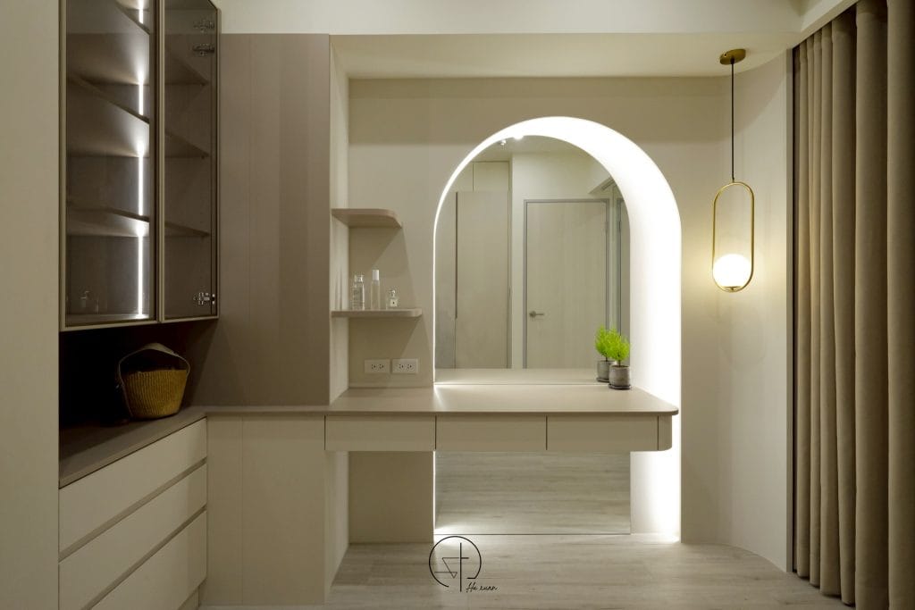 更衣室延續客餐廳的設計語彙,圓拱造型與線性燈飾引導視線流動,形塑柔和且富有層次感的過渡空間,讓整體視覺風格更加一致且富有節奏感。