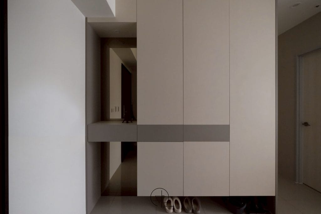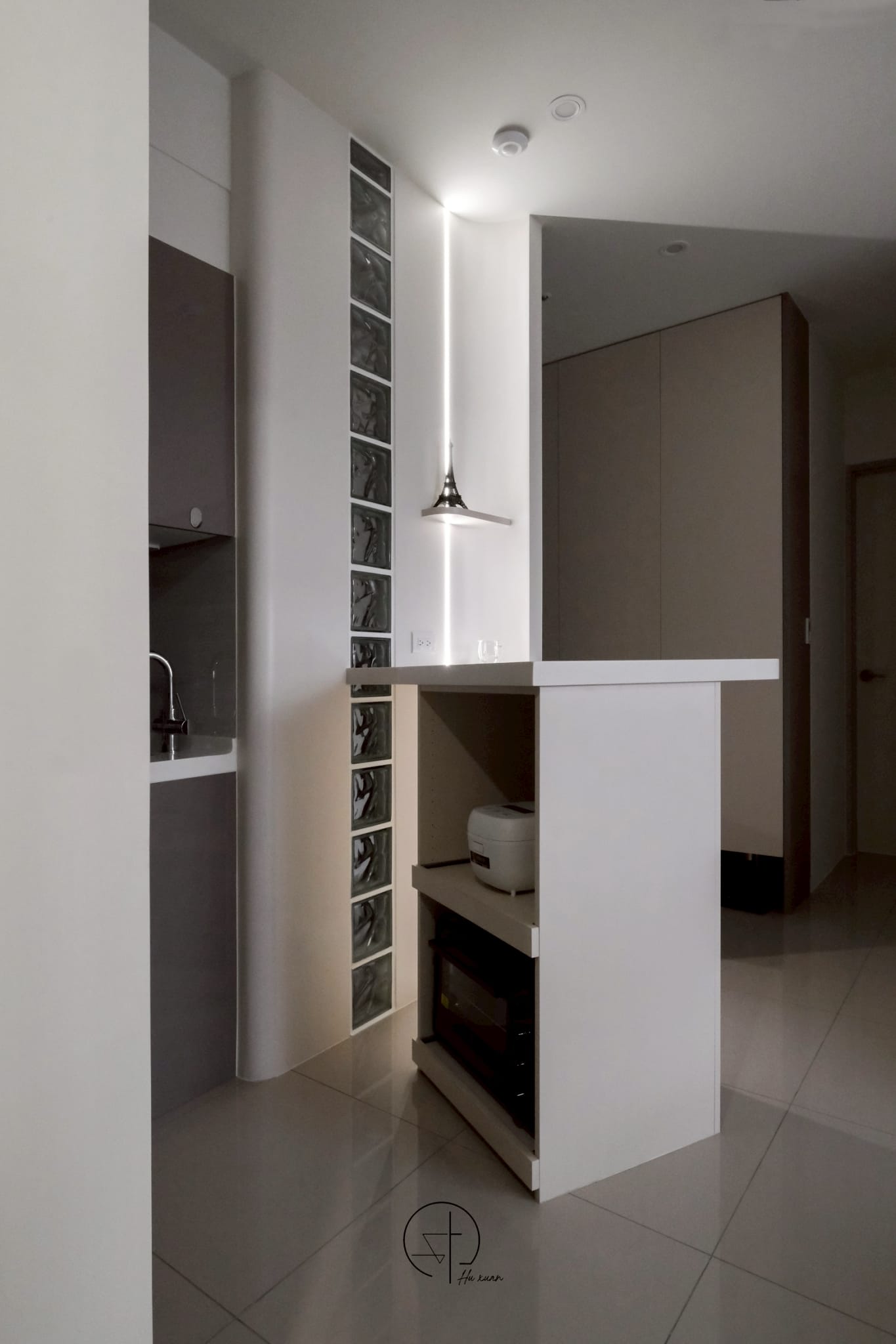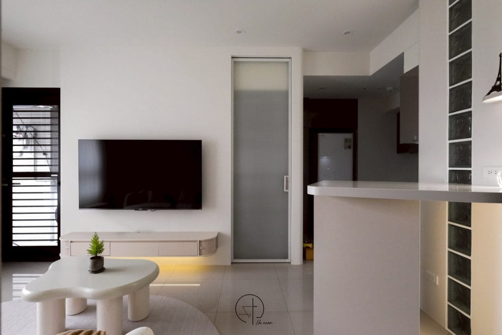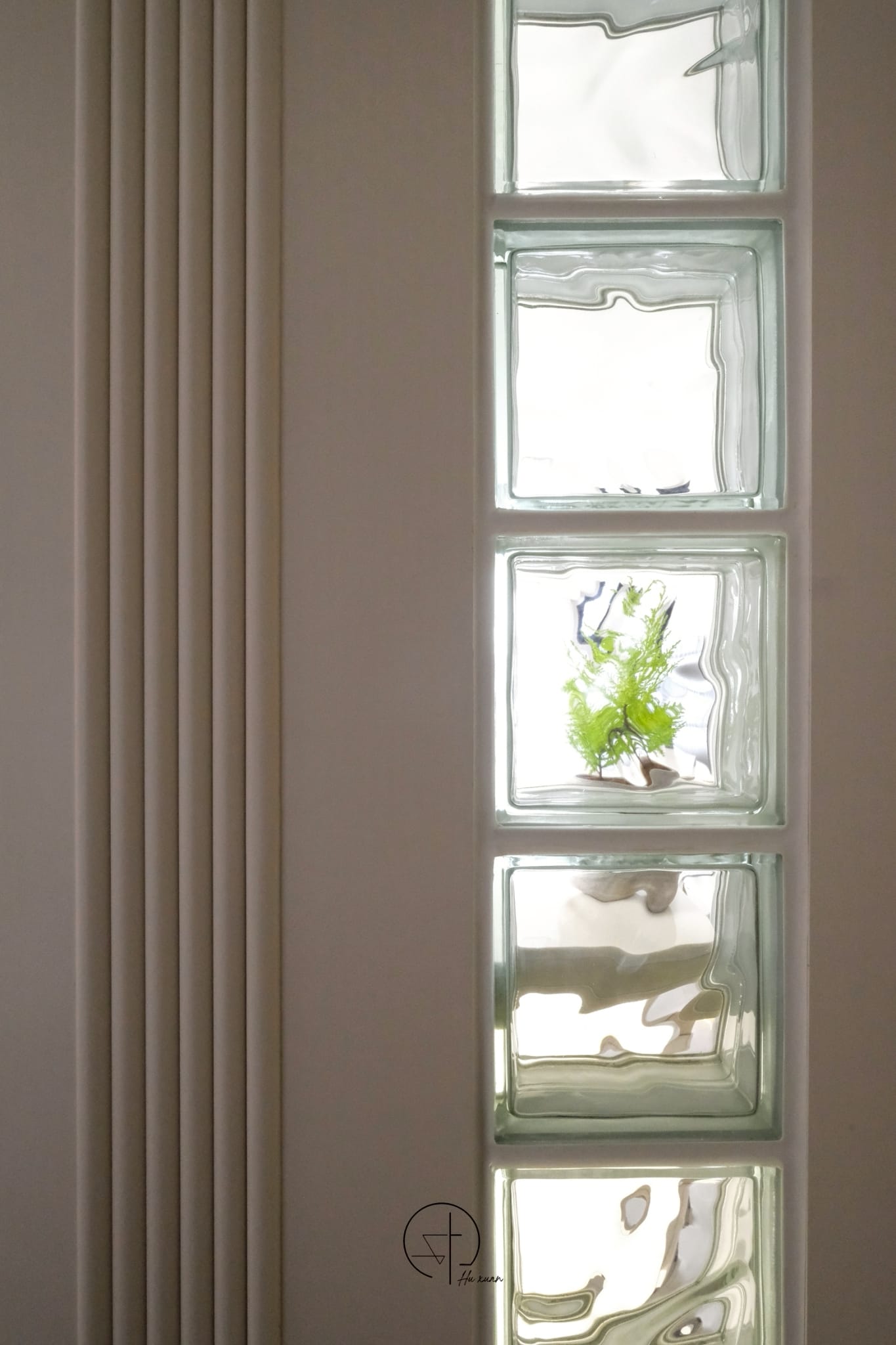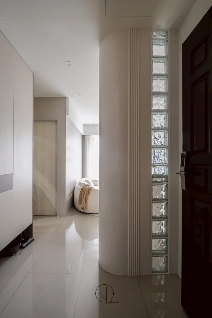 設計師巧妙規劃入口玄關,以玻璃磚作為視覺焦點,兼具透光與隱私功能,不僅引入自然光,也維持空間的純淨與寧靜。玄關屏風結合中島與電器櫃設計,並搭配線性燈光,增添垂直與水平的層次感,在小巧空間中創造出兼具實用與美感的多功能平台。